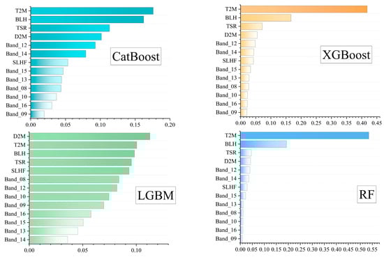 Then, we calculated importance coefficients for each feature with respect to the four machine learning models, as depicted in Figure 3. In each model, the meteorological factors T2M and BLH demonstrated significant importance, which was consistent with the computation of the PCC. The observed outcome can be attributed to the reduction in the BLH, resulting in the accumulation of O3 precursors, namely nitrogen oxides (NOx) and volatile organic compounds (VOCs), in close proximity to the surface []. Moreover, T2M is essential in the chemical reaction that results in the synthesis of O3 from the precursors NOx and VOC. The contribution of features was more evenly distributed in both the CatBoost and LGBM models, especially in the LGBM model. In the CatBoost model, the BT data of band 12, in addition to meteorological conditions, also made a substantial contribution. Regarding the XGBoost and RF models, the BT data largely functioned as a model correction component, making a smaller contribution to the model compared to T2M and BLH, which played more major roles.
