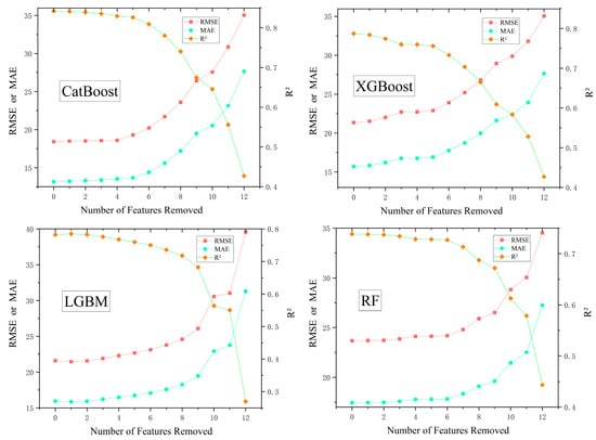 Subsequently, we carried out a systematic process of feature reduction. This involved starting with the features that were determined to be the least essential based on their importance coefficients in various models. For each feature removal, we reported the model’s validation metrics (R2, RMSE, MAE) on the test dataset. The procedure is depicted in Figure 4. When features were eliminated one by one individually in the CatBoost, XGBoost, and RF models, the R2 of the models generally decreased, while the RMSE and MAE typically increased. This suggests a progressive deterioration in the performance of the models. Nevertheless, the LGBM model exhibited a slight increase in R2, accompanied by decreased RMSE and MAE values, upon the removal of the first feature. This indicates a moderate improvement in the model’s performance. The reason for this could be that LGBM employs a leaf-wise growth approach as opposed to the conventional depth-first technique. This strategy prioritizes increasing the depth of trees rather than expanding all branches at each level. Eliminating one feature could potentially enhance tree segmentation, resulting in an improved performance of the model. To optimize the predictive performance, we eliminated the feature with the lowest importance scores for LGBM while keeping the features unchanged in the other models.