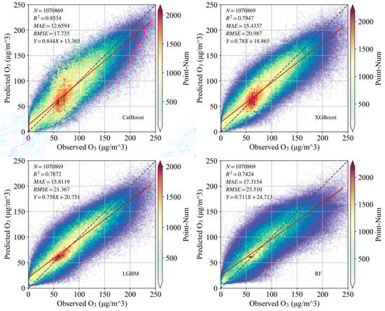 Based on the results discussed in Section 3.1, we trained the four models using the features that achieved the best predictive performance for each model. The CV performance of each model is shown in Table 2 and Figure 5. The R2 values for the CatBoost, XGBoost, LGBM, and RF models were 0.8534, 0.7947, 0.7872, and 0.7424, respectively. The RMSE values were 17.735 μg/m3, 20.987 μg/m3, 21.367 μg/m3, and 23.510 μg/m3, respectively. The MAE values were 12.6594 μg/m3, 15.4337 μg/m3, 15.8119 μg/m3, and 17.3154 μg/m3, respectively. From CatBoost to RF, the model’s fitting performance rapidly diminished, and the errors for the target variable progressively increased.