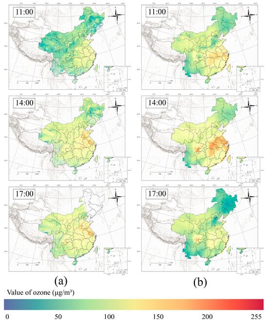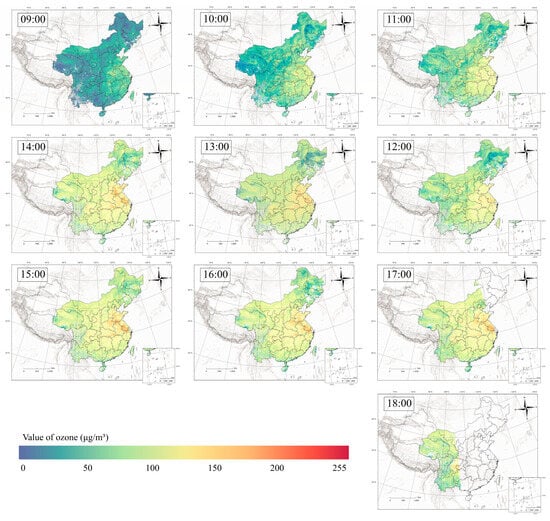 When considering the temporal aspect, combining these two figures, we observed that the predicted ground-level O3 concentrations as well as the standard deviation experienced a significant and quick increase from 09:00 to 13:00. This phenomenon was caused by the increasing solar radiation and temperature [], which facilitate the chemical production of ground-level O3. Subsequently, the mean ground-level O3 concentrations reached a steady state of approximately 105 μg/m3 until sunset, as ground-level O3 does not disperse quickly before dusk. Regarding the sudden changes at 16:00, the easternmost section of the study area began to be influenced by the sunset, leading to a rapid dissipation of ground-level O3. At this time, the sunset had a lesser effect on the remaining research area and did not yet cause the dissipation of ground-level O3. Consequently, the mean of ground-level O3 concentrations increased. Between 17:00 and 18:00, the influence of the sunset progressively extended to the middle and western areas of the study area. However, due to the limitations of the Himawari satellite, we were unable to collect data after sunset. Consequently, the statistics for both periods do not include the lowest ground-level O3 concentrations in the eastern portion of the area. As a result, the mean of ground-level O3 rose in comparison to the prior period.