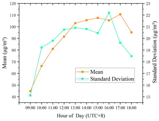 We chose the week from 20 September to 26 September 2021, which had the lowest level of cloud contamination. We performed hourly assessments of ground-level O3 concentrations from 09:00 to 18:00 (UTC + 8) for each day throughout that week and subsequently calculated their average. Figure 6 displays the results of the multi-day average estimation of ground-level O3 concentrations for each hour. Following that, we conducted a statistical analysis on the estimated hourly ground-level O3 concentrations, computing the mean and standard deviation, as shown in Figure 7.