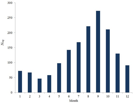 The approach based on the application of a deep neural network has a certain merit, as it allows one to search for internal relations between seeing variations and the evolution of some background states of atmospheric layers at different heights. We use the medians of seeing estimated from measurements of differential displacements of stellar images at the site of the Maidanak observatory as predicted values. We should note that routine measurements of star image motion are made at the Maidanak observatory using the Differential Image Motion Monitor (DIMM) [,]. The database of measured seeing is available for two periods: 1996–2003 and 2018–2022. In Figure 1, we present the total amount of DIMM data for each month during the acquisition period. The 13-year dataset used covers a variety of atmospheric situations and is statistically confident. Analysis of Figure 1 shows that the fewest number of nights used for machine learning occurs in March. The best conditions correspond to August–October, when the observatory has a good amount of clear time.
