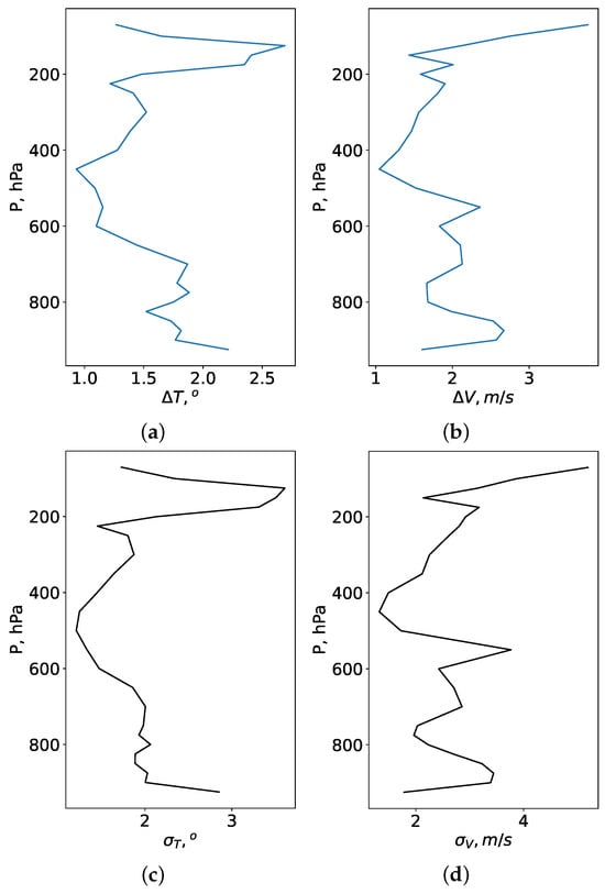 Considering wind speed, the deviations between the measured and modeled parameters are pronounced. and are 2.2 m/s and 2.7 m/s, respectively. In the lower layers of the atmosphere, the mean absolute error and the root mean square deviation are 2.9 m/s and 3.6 m/s. High deviations in the wind speed correspond to the atmospheric levels under a large-scale jet stream (200 hPa). Within the upper atmospheric layers, can reach 4.0 m/s.