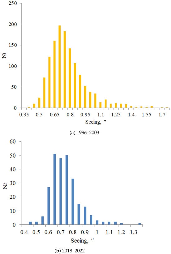 Histograms of measured seeing values at the Maidanak observatory for two periods: (a) 1996–2003 and (b) 2018–2022. is the number of cases.