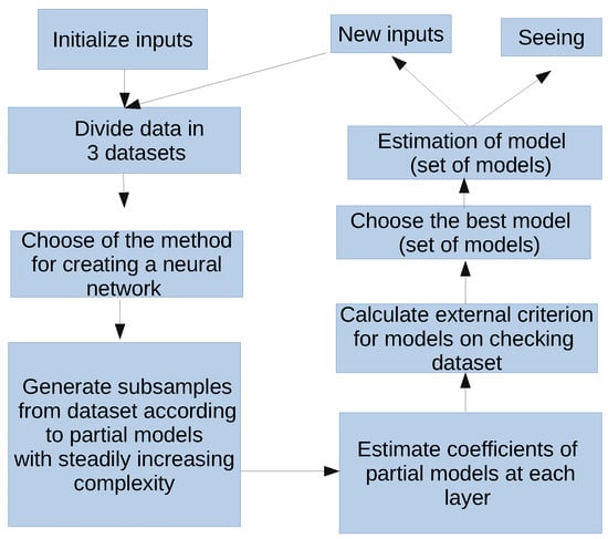 A flowchart for the creation of neural networks is shown in Figure 5. According to this flowchart, the initial time series are divided into training, checking, and validation datasets. The main stage is training the neural network and generation of partial models. In particular, learning is based on data pairs of observed input and output variables. Using different inputs (meteorological characteristics) we optimized the final structure of the neural network.