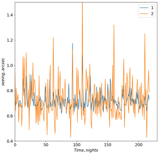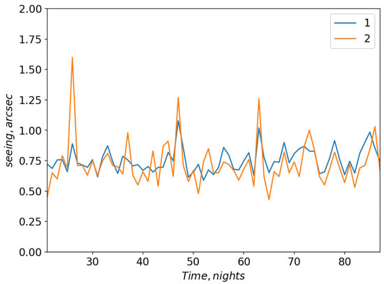 Changes in model and measured seeing values. Seeing values are estimated using validation dataset. The number of configuration of the neural network is 2. Line 1 corresponds to measured seeing. Line 2 corresponds to modeled seeing.