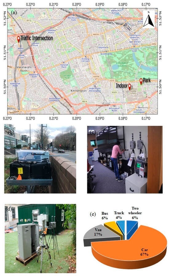 (a) Map showing the location of all the measurement sites (red points) with pictures showing the sampling sites of the (b) traffic intersection, (c) indoor, (d) park, (e) vehicular fleet data of the traffic intersection sites during the daytime throughout the sampling duration.