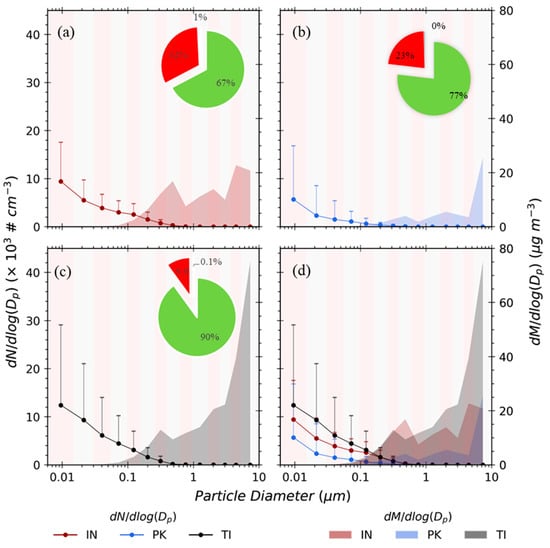 Average particle number size distributions (lines) and particle mass distributions (shaded regions) in different MEs: (a) IN, (b) PK, (c) TI, and (d) all three MEs. The pie chart shows the percentage contribution of particles in each mode in different MEs: the green-coloured part is N6–30; the red-coloured part is N30–300; and the maroon-coloured part is N300–10000—which is negligible for the coarse particles.