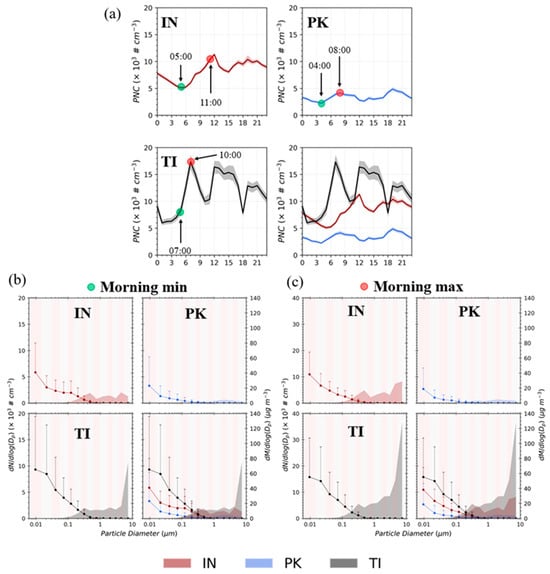Average number and mass distributions at morning peaks: (a) diurnal variation of PNC showing the selected hours for minimum (green dot) and maximum (red dot) peaks in each microenvironment; (b,c) particle number size distributions (lines) and particle mass distributions (shaded regions) for minimum and maximum peaks, respectively.