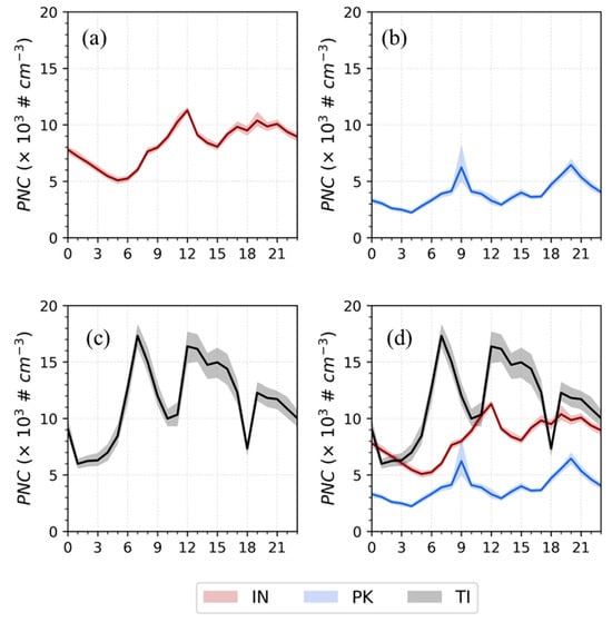 Average diurnal profiles of PNCs were continuously measured in (a) IN, (b) PK, (c) TI, and (d) all three microenvironments.