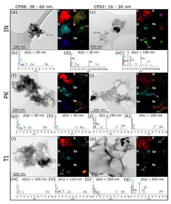 STEM-EDX maps showing representative ultrafine particles from each site collected on two filter size fractions, CP08 (38–60 nm) and CP02 (16–30 nm), for the IN (a,c), PK (f,i), and TI (l,p) and the corresponding point EDX spectrum shown for particles in the IN (b,d,e), PK (f,i), and TI (m–o,q).