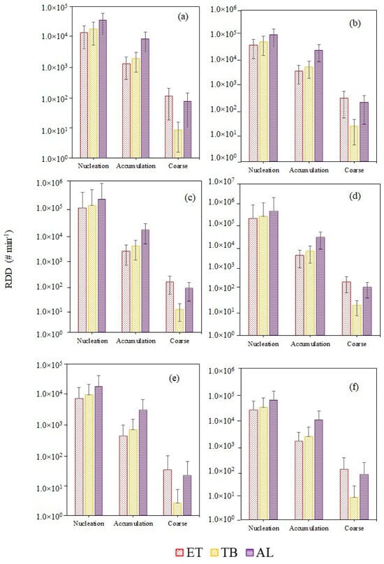 The exposure to PNCs at all three sites was calculated in terms of the RDD rate (i.e., number of particles deposited in lungs per unit time, #min−1) and was calculated for the different modes of particles during rest and exercise. RDD rates are a product of deposition fraction, PNCs, tidal volume, and breathing frequency [,,]. DF values (fraction of particles deposited) for different size ranges were extracted from the average data of males and females for total and regional deposition for light exercise predicted from the ICRP deposition model [] for different regions of the human respiratory tract (HRT); extrathoracic region (ET), tracheobronchial region (TB), and alveolar region (AL):
