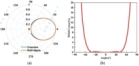 The beamwidth of the half-wave dipole antenna is 78°, and the Gaussian simulation is also set with the same beamwidth. Figure 1a shows the comparison of far-field patterns between the Gaussian beam and the half-wave dipole antenna, while Figure 1b illustrates the relative error between the two beams. The results demonstrate that the far-field pattern function of the two beams accurately simulates the half-power beamwidth, with a relative error of less than 2%. As the radiation angle increases, the relative error between the two beams gradually increases. At a deviation of 60° from the main beam, the relative error reaches 5% and rapidly increases.
