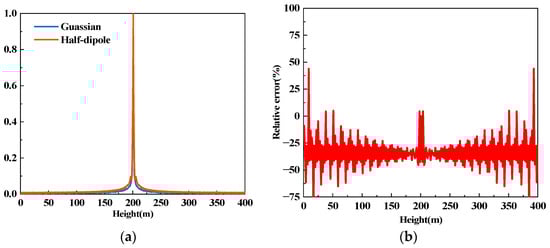The transmitting antenna is positioned at a 0-degree elevation angle with a height of 200 m, and the calculated vertical direction height is 400 m. The pattern functions of the two beams are substituted into Equations (11)–(14), resulting in two initial fields shown in Figure 2a and the corresponding relative errors depicted in Figure 2b.