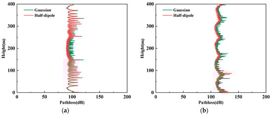 The atmospheric environment used for calculation is the standard atmosphere, with the standard atmospheric refractive index profile. The underlying surface is flat soil with a relative dielectric constant of 4 and an electrical conductivity of 0.03. The calculation area covers the loss of space wave propagation within a horizontal distance of 10 km and a vertical distance of 400 m. The simulation calculation is focused on the regional radio station in Wuhan, operating at a radio frequency of 92.7 MHz. Figure 3a,b presents the calculation results of propagation loss within a vertical height of 400 m. The green solid line represents the Gaussian beam approximation result, while the red solid line represents the simulation calculation result of the half-wave dipole antenna.