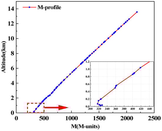is the dew point temperature (°C), and  is the saturated water vapor pressure (hPa). When the dew point temperature is below zero,  = 6.1115;  = 23.036;  = 279.82, and  = 333.7. When the dew point temperature is above zero,  = 6.1121;  = 18.678;  = 257.14, and  = 234.5. According to Equations (23)–(26), the corrected atmospheric refractive index profile for the day is calculated as shown in Figure 4.