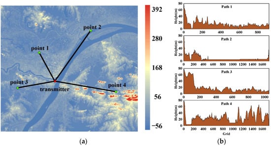 In real propagation scenarios, radio wave propagation modeling needs to take into account the influence of the actual terrain. We have collected geographical information on the Wuhan area and extracted the topographic profile and other relevant information along the propagation path. Figure 5a shows the topographic map of Wuhan and the location information of measuring points in the signal measurement coverage area. Four different measuring points are selected from the experimental measurement path, and different radio wave propagation paths are obtained by connecting transmitting points and measuring points. The four paths include actual propagation scenarios, such as overwater surfaces and mountains. The topographic profile was obtained by meshing the four propagation paths, as shown in Figure 5b. The elevation data from different topographic profiles are analyzed to distinguish the underlying topographic features of each propagation path.