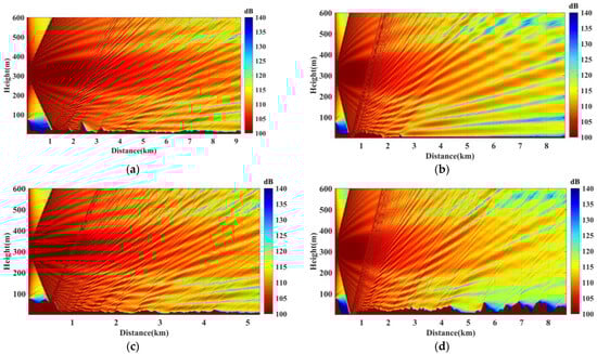 Figure 3 shows that the obvious difference in the propagation loss of the two beams at 0.75 km is mainly concentrated in the main beam region. The electric field energy distribution using the Gaussian approximation is more dispersed and shows a larger propagation loss near the main beam. The average difference in the propagation loss of the two beams in the range of 150–250 m is 2.29 dB, and the average difference in the loss in other height ranges is 1.22 dB. The difference in propagation loss between the two beams at 10km is reduced, and the average difference in loss is 1.49 dB. The phenomenon of beam splitting is obvious, which reflects the inversely proportional change in radiation field energy and distance square. It also reflects the influence of the superposition of underlying surface-reflected waves in radio wave propagation.