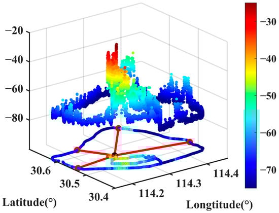 In Figure 7, the black dot represents the radiation source; the red dot represents the measurement point, and the red line represents the radio wave propagation path. The radiation source of this paper is Gui-shan Signal Tower in the Wuhan area, and its transmitting power is 10 kw; thus, the transmitting power is 70 dBm []. Considering the impact of small-scale fading, the distance between the measurement points for receiving power should fall within the range of 20 to 40 times the wavelength []. The experimental measuring vehicle maintains an average speed of 44.9 km/h, and the average data collected within a 6-s interval satisfy the requirements for data processing. The average received power at the four measuring points is −64 dBm, −71.2 dBm, −65.5 dBm, and −72.9 dBm, resulting in real propagation losses of 134.0 dB, 141.2 dB, 135.5 dB, and 142.9 dB, respectively.