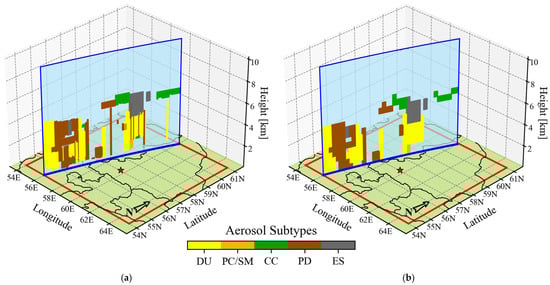 Information on the type of tropospheric aerosol provided by the CALIPSO satellite data on 25 August 2017 from 22:44:04 to 22:46:03 UTC: (a) initial spatial distribution (altitudes in relation to the averaged sea level); (b) horizontal (15 km) and vertical (0.5 km) averaged data (altitudes in relation to the Earth’s surface). The analyzed area is marked by the red frame. The blue frame shows the space scanned by the CALIPSO satellite. The AERONET site located in the Middle Urals is marked with a red asterisk. Abbreviations stand for: DU—dust, PC/SM—polluted continental/smoke, CC—clean continental, PD—polluted dust, and ES—elevated smoke.