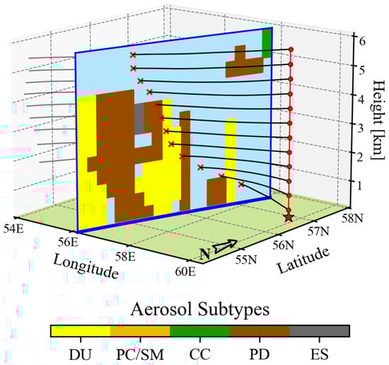For satellite tracks passing at a distance from the AERONET site, we analyzed their intersections with the trajectories of air flows (forward and backward). Figure 2 illustrates a part of the track from Figure 1 and the backward air trajectories intersecting it, starting at different altitudes from the AERONET site at the measurement moment—26 August 2017 06:06:00 UTC (Coordinated Universal Time). The start positions of the trajectories are marked with red dots, the intersection points of the air trajectories and the satellite track are marked with red crosses. In general, air trajectories starting at different heights intersect the satellite track in different points. Under the CALIPSO classification, we determine the type of an atmospheric object or the type of aerosol (hereinafter simply the type of an atmospheric object) at the intersection points. If several intersections of the air trajectories and satellite tracks are fixed at the same moment of the AERONET measurement, such a value of the type of an atmospheric object is selected that has the minimal difference between the time of the satellite’s flight and the time when the air flow trajectory reaches the intersection point. In this way, we receive a table containing data on the NVSD parameters restored by AERONET, characterizing the aerosol content along the entire atmospheric column and data on the type of atmospheric objects by the CALIPSO classification at different altitudes compared with them.