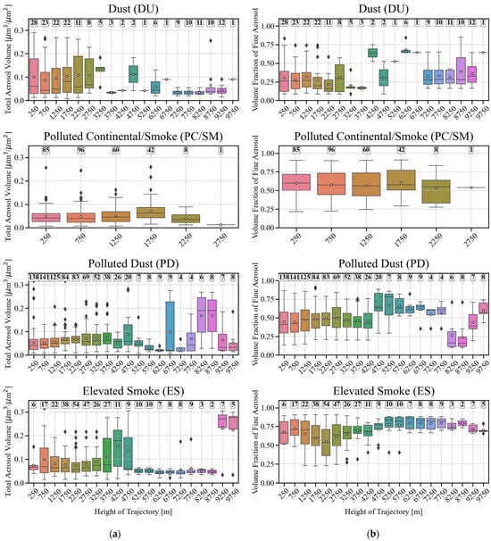 Statistical characteristics of the total aerosol volume along the atmospheric column (a) and fine aerosol volume fraction (b) at the AERONET site depending on the altitude and type of aerosol by the CALIPSO data. The horizontal line inside the box represents the median, the white dot indicates the arithmetic mean, while the black dots indicate outliers that are beyond the 1.5 interquartile distance. The upper part of the graph above each box indicates the sample size for which the corresponding box was built, i.e., the number of cases when the AERONET measurement could be compared with a specific type of aerosol by the CALIPSO classification.