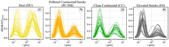 The standard products of AERONET inversion are the volume of aerosol particles along the atmospheric column, the median radius, and the standard deviation from the median radius for two aerosol fractions, which help approximate the real aerosol particle size distribution in the form of a bimodal lognormal distribution [42]. The works focusing on the typification of atmospheric aerosols present the volume particle size distribution as follows: