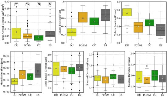 Statistical characteristics of the total aerosol volume along the atmospheric column and parameters of normalized volume size distributions of aerosol particles for different aerosol types by the CALIPSO classification. The horizontal line inside the box represents the median, the white dot indicates the arithmetic mean, while the black dots indicate outliers that are beyond the 1.5 interquartile distance. The upper part of the first graph above each box indicates the sample size for which the corresponding box was built, i.e., the number of the normalized volume size distributions of aerosol particles by the AERONET data, which we were able to relate with a certain aerosol type by the CALIPSO classification. Abbreviations: DU—dust, PC/SM—polluted continental/smoke, CC—clean continental, and ES—elevated smoke.