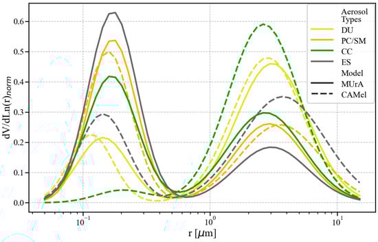 Comparison of normalized volume size distributions of aerosol particles built on the regional aerosol model for the Middle Urals (solid lines) and the global aerosol model (CAMel, dotted lines) for different aerosol types by the CALIPSO classification. Abbreviations: DU—dust, PC/SM—polluted continental/smoke, CC—clean continental, and ES—elevated smoke.
