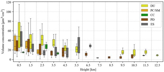 Statistical characteristics of the vertical distribution of atmospheric aerosol volume concentrations calculated on the basis of regional MUrA model from CALIPSO measurements. Abbreviations: DU—dust, PC/SM—polluted continental/smoke, CC—clean continental, PD—polluted dust, and ES—elevated smoke.