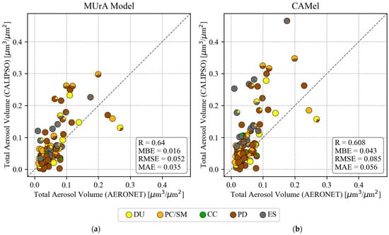 Comparison of the total volume of aerosol particles along the atmospheric column recovered by the results of satellite measurements of the CALIPSO attenuation coefficient at the wavelength of 532 nm using the OMCAM technique based on the regional aerosol model for the Middle Urals (MUrA model) (a) and the global aerosol model CALIPSO (CAMel) (b) with the AERONET inversion data. Spearman’s correlation coefficient (R), the mean bias error (MBE), the root mean squared error (RMSE) and mean absolute error (MAE) are given in the legend. The dotted line represents identity line. Abbreviations: DU—dust, PC/SM—polluted continental/smoke, CC—clean continental, PD—polluted dust, and ES—elevated smoke.