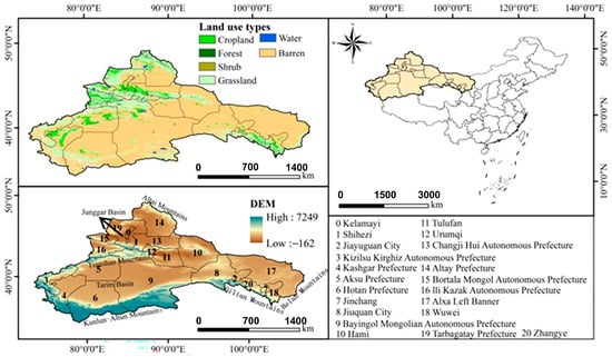 The ARNC, located in the ranges 35~50° N and 73~107° E, is a very important part of the arid central region of the Asian continent (Figure 1). The total area of arid land in Northwest China is about 2.5 × 106 km2, accounting for approximately 25% of China’s land area [], as shown in Figure 1. It is located north of the Qilian Mountains and Kunlun–Altun Mountains and west of the Helan Mountains. The ARNC includes the entire Xinjiang Uygur Autonomous Region (hereinafter referred to as Xinjiang), the five cities of Gansu Hexi, and the huge Alashan League in Inner Mongolia []. The ARNC is limited by the border of China to the north and west. The northwest arid area is an inland area with less than 400 mm/year of annual precipitation [], belonging to the extremely arid area. From east to west, the land-use types include grassland, desert steppe, desert, Hulunbeir Grassland, rocky Gobi, sand dune, inland river, inland lake, and oasis. The natural vegetation is gradually decreasing because of human activity.