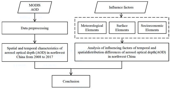 The framework of this study is visualized in Figure 2. The study was conducted in four major steps: (1) reconstruction of annual and seasonal average AOD grid maps with ArcGIS tools; (2) analysis of the slope of the AOD changes at the regional and pixel scales to reveal spatial–temporal variation; (3) resampling of the DEM, NDVI, and LST data to a spatial resolution of 1° × 1° []; and (4) an evaluation of the correlation between AOD and its influencing factors using the correlation coefficient (R) approach. The R values vary from 0 to 1, with 1 representing a perfect correlation between AOD and its driving factors.