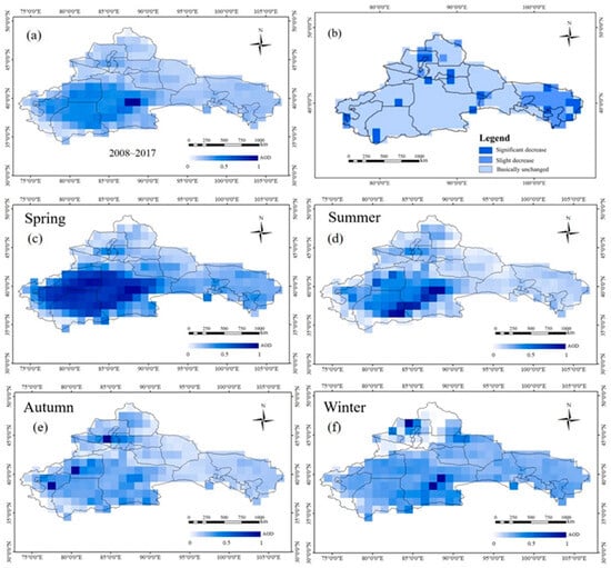 Variation trends in AOD in the ARNC from different years and different seasons ((a) spatial distribution of AOD during 2008–2017; (b) distribution of change trend types; (c–f) spatial distribution of AOD in different seasons).