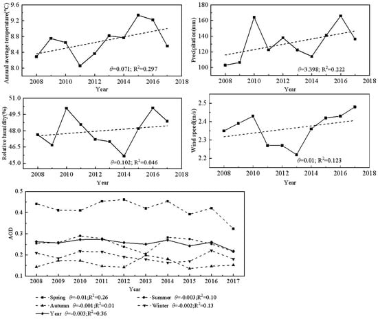 From 2008 to 2017, all meteorological variables showed an increasing trend. Meteorological factors showed a certain regularity at an annual scale with different degrees. The changes in seasonal AOD all show decreasing trends. Overall, it was shown that the inter-annual variation in AOD decreased from 2008 to 2017, with a decreasing trend becoming obvious since 2013.