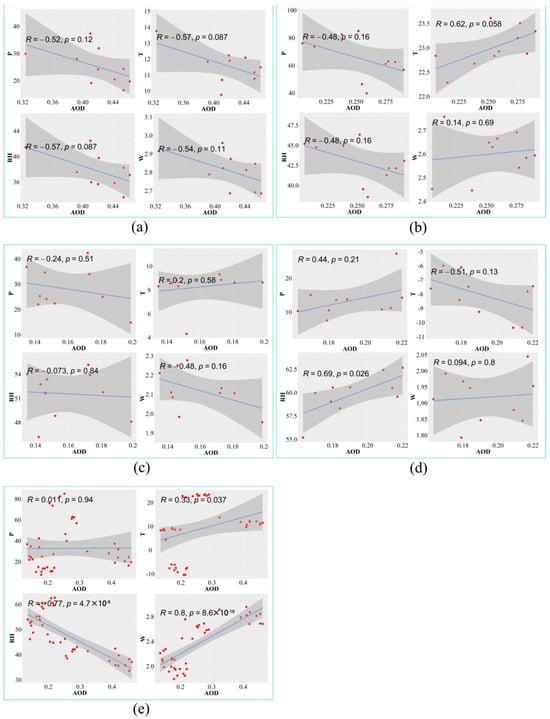 Correlation between AOD and meteorological factors. (a) spring; (b) summer; (c) autumn; (d) winter; (e) annual. Note: P, precipitation (mm); T, temperature (°C); RH, relative humidity (%); W, wind speed (m/s). Note: The red dots indicate the specific values for each data point, the gray bands indicate the confidence intervals for the linear regression, and the line indicates the regression line obtained by fitting a linear regression.