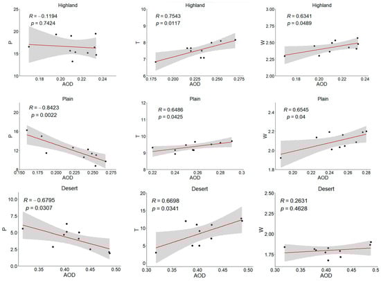 Correlations between AOD and meteorological factors in highlands, plains, and deserts in the ARNC. Note: P, precipitation (mm); T, temperature (°C); W, wind speed (m/s). Note: The black dots indicate the specific values for each data point, the gray bands indicate the confidence intervals for the linear regression, and the line indicates the regression line obtained by fitting a linear regression.
