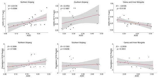 In Figure 8, both Northern Xinjiang and Southern Xinjiang show a positive correlation between AOD and GDP and between AOD and population, but Gansu and Inner Mongolia show a negative correlation. The reason why AOD and GDP and AOD and population do not show consistent and defined performance in different districts is that aerosol sources in the ARNC are dominated by natural sources [].