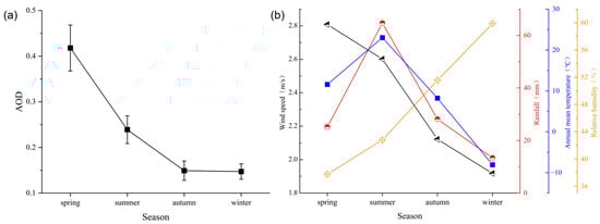 Seasonal variation in AOD (a) and meteorological factors (b). The color of the line corresponds to the color of the axes and indicates the change in the axis variable.