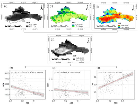 The distribution of AOD shows obvious spatial differences in the ARNC, which is closely related to the underlying surface. LST, terrain fluctuations, and vegetation coverage all have an impact on the formation and development of aerosols. The findings show that AOD is positively correlated with surface elevation and surface temperature and negatively correlated with the NDVI. Figure 10a,d show that the distribution of AOD and topography have clear similarities. High AOD values are mainly concentrated in the high-altitude areas, with significantly higher AOD values over the Altun Mountains, the Qilian Mountains, and the Kunlun Mountains. In contrast, AOD values are significantly lower in low-altitude areas such as the Altay and Hami areas. Figure 10b illustrates that DEM and AOD have a certain positive correlation, where the higher the region, the greater the AOD value. The reason for the high AOD values in high-altitude areas could be due to the influence of terrain, where the transported sand dust and other pollutants are prevented from spreading to other areas, thereby accumulating around the mountain areas [].