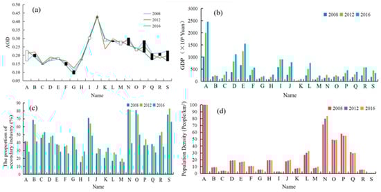 Statistics of AOD distribution, regional GDP, the gross product of secondary industry, and population density in the northwest arid region in 2008, 2012, and 2016. (a) AOD; (b) GDP; (c) the proportion of secondary industry; (d) population density. Note: A: Urumqi city; B: Turpan area; C: Hami area; D: Changji Prefecture; E: Yili Prefecture; F: Tachen area; G: Altay area; H: Bortala Mongol Autonomous Prefecture; I: Bayingol Mongolian Autonomous Prefecture; J: Aksu area; K: Kirgiz Prefecture; L: Kashi area; M: Hotan area; N: Jiayuguan City; O: Jinchang City; P: Wuwei City; Q: Zhangye City; R: Jiuquan City; S: Alxa League; same below.