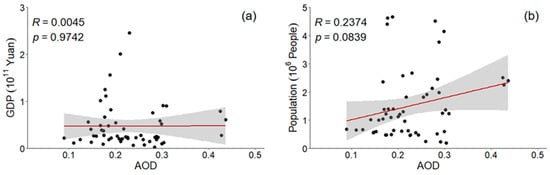 The links between inter-annual variations in AOD and GDP and AOD and total population averaged by highly populated parts of the ARNC (a) the correlation between AOD and GDOP; (b) the correlation between AOD and Population). Note: The black dots indicate the specific values for each data point, the gray bands indicate the confidence intervals for the linear regression, and the line indicates the regression line obtained by fitting a linear regression.