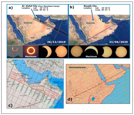 Upper panels: locations of the sites of the observations on the map of the Kingdom of Saudi Arabia at Al-Hofuf City [panel (a)] and Riyadh City [panel (b)]; the paths where the eclipse was seen as annular are also shown (as strips). Middle panel: a time sequence sample of our observations of the two eclipses. Images around maximum phases are highlighted. Panel (c), a map showing the penumbral track of the annular solar eclipse of 26 December 2019 through Saudi Arabia, Qatar, United Arab Emirates, and Oman (map by Michael Zeiler; reproduced with permission). Panel (d), a map showing the penumbral track of the annular solar eclipse of 21 June 2020 through the Republic of Congo, Democratic Republic of Congo, Central African Republic, South Sudan, Ethiopia, Eritrea, Yemen, Saudi Arabia, and Oman. [map by Michael Zeiler, https://www.greatamericaneclipse.com/, accessed on 1 May 2021 (reproduced with permission)].