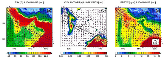 Regarding the atmospheric condition at meso-scale level on 26 December 2019, in the region of the Arabian Peninsula, it was estimated at 06:00 (local time) by Nelli et al. (2020a) [7] by applying ERA-5 reanalysis data at 0.25° × 0.25° spatial resolution. Their results are presented in Figure 3, which gives the 10 m horizontal winds, surface temperature, total cloud cover, and precipitable water (i.e., total amount of water vapor in the atmosphere) just before the local sunrise. Their analysis showed that, except for the coastal parts of Oman, Qatar, and the neighboring Saudi Arabia, skies were generally clear in the region (center panel of Figure 3), which coincides with the December climatology described above. Low atmospheric moisture (right panel of Figure 3) induced strong radiative cooling, producing nighttime temperature values below 10 °C in some areas, as shown in the left panel of Figure 3. A wind inspection indicates that northeasterly winds prevailed over the Arabian Sea, which penetrated inland Oman and eastern Saudi Arabia.