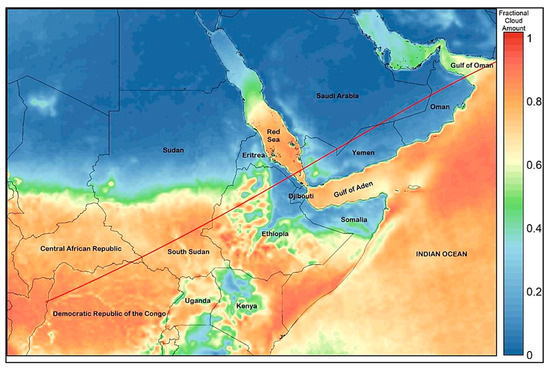 In Yemen, summer months come under the influence of the southwest monsoon reversing winds, bringing humidity and small amounts of rain to the highlands and a general cloudiness to the rest of the country [32,33]. Most of this cloud is convective in nature and builds in the afternoon, leaving the mornings and the eclipse with a generous, sunny climatology. Average morning cloud peaks at just over 20%, about half of that measured in the early afternoon. Inland, 250 km from the Red Sea coast, at Ma’rib, the eclipse track leaves the Western Plateau and moves out onto the Ruba’al Khali in Saudi Arabia, which is a landscape of sand dunes receiving cold fronts with strong northwest winds bringing the Shamal [34,35,36]; this is more often associated with Iraq and the Persian Gulf countries [37]. The few ground-based measurements in this region show that the percent of possible sunshine ranges from 68% to nearly 80% along the track, with the lowest values over Yemen and the highest over Oman.