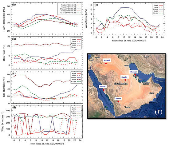 Meteorological conditions on 21 June 2020 over Saudi Arabia for five stations indicated on the map. (a) Air temperature, (b) DP, (c) RH, (d) wind direction, (e) wind speed, and (f) geographic locations of the five cities under consideration. Data was derived from https://mesonet.agron.iastate.edu/request/download.phtml?network=SA ASOS, accessed on 1 May 2021.