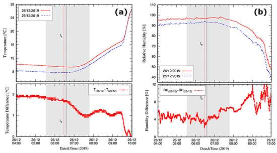 Temporal evolution of the temperature (a) and RH (b) at Al-Hofuf between 04:00 and 10:00 on the annular eclipse day (red continuous line), 26 December 2019, compared to previous non- eclipse of 25 December 2019 (blue short-dashed line). The vertical dotted line indicates the sunrise time, tr. The shaded area refers to the solar eclipse phase, while the shaded area between vertical lines indicates the short phase of the annularity. Note the high magnitude values of RH at the Al-Hofuf site during this season, which is over the average shown in Table 2. The bottom panels highlight the differences between eclipse and non-eclipse days, ΔT26−25 and ΔRH26−25.