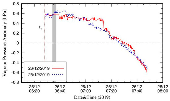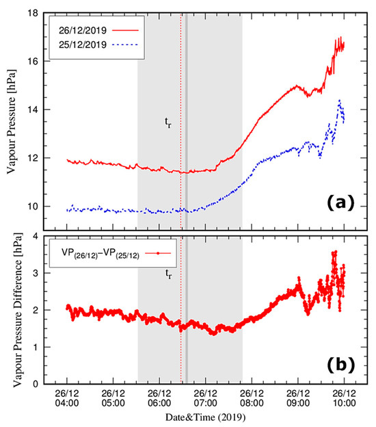 Upper panel (a): Vapor pressure variation at Al-Hofuf on 25 and 26 December 2019 between 04:00 and 10:00. Both patterns are similar except that eclipse day values of VP were greater than those of the non-eclipse day. No signal of any eclipse effect was detected during the observation that took place at that site between 06:28:07 (at sunrise) and 07:47:57. Lower panel (b): The difference in VP at Al-Hofuf between 26 December 2019 (eclipse day) and the day before, from 04:00:57 to 09:59:57. The vertical dotted line (tr), the shaded area and the shaded area between vertical lines have the same meaning as in Figure 6. This variable tended to decrease as long as sunrise was approaching; it continued in this way but under the presence of an annular eclipse in progress at dawn. At some point, such difference began to increase, as shown from 07:40 until after 08:52 when strong oscillations appeared. There was no perturbation or effect produced by this eclipse over VP.