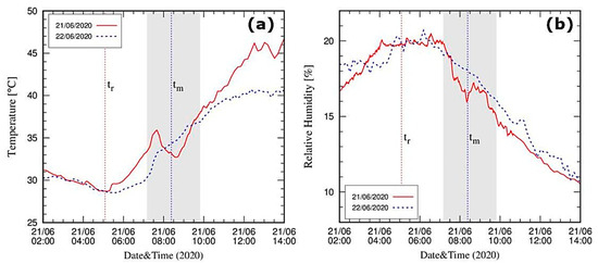 Temperature (a) and RH (b) zoomed-in views between 02:00 and 14:00 during the Riyadh partial eclipse of 21 June 2020. Sunrise and maximum time are shown as vertical dotted lines. Shaded area refers to the eclipse phase. Panel (a) highlights some characteristics related to the observed temperature drop (see text for more details). These results (red continuous lines) can be compared with a non-eclipse day of 22 June 2020 (blue short-dashed lines).