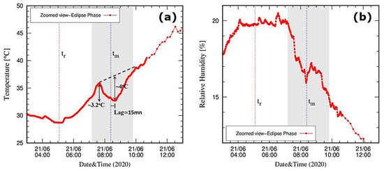 A black short-dashed line to simulate a hypothetical non-eclipse temperature trend is shown in Figure 10a. This gives a characteristic dip temperature of about 4 °C over a shape of full width at half-maximum (FWHM) of ∼65 min, whereas a value of about 3.2 °C is estimated as a maximum-to-minimum fall in an interval of almost 56 min. The first dip temperature is known as temperature absolute anomaly, and the second dip as temperature linear anomaly [45]. Additionally, a time lag (time between maximum obscuration and the reached minimum) is distinguishable; we estimate to be it about 15 min.